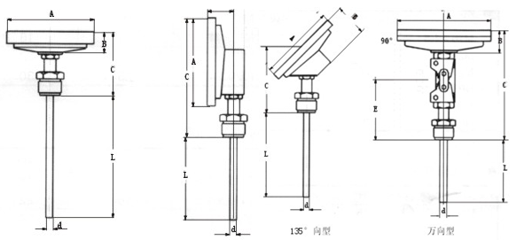 选型须知:请提供型号、表盘直径、精度等级、安装固定形式、测温范围、保护管材质、长度。选型举例:万向型双金属温度计,表盘直径Φ100,测温范围0~400℃,1.5级,活动外螺纹M27×2,长度450mm WSS-481, 0~400℃,L=450, M27×2,1.5级